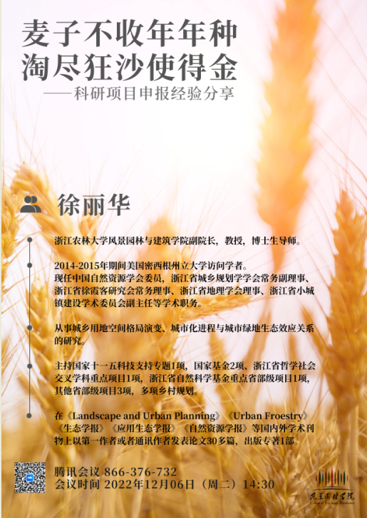 2022年12月6日(周二)下午14:30徐丽华教授科研项目申报经验分享预告